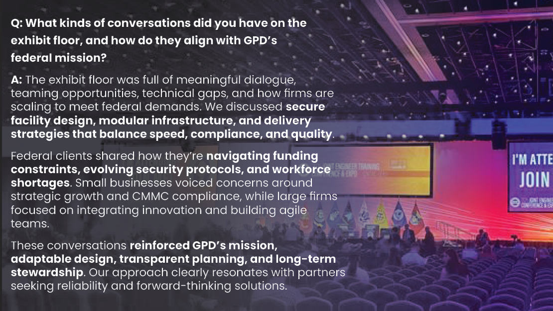 A: JETC 2025 was a masterclass in collaboration. The sessions reinforced how critical it is to align infrastructure planning with mission readiness, especially in today’s rapidly evolving threat landscape. I was struck by the emphasis on resilience, adaptability, and the role of A&E and Construction professionals in supporting national security. The Innovation Pavilion showcased technologies that aren’t just futuristic; they’re actionable now. And the conversations around procurement transparency and interagency coordination were especially relevant to the work we do at GPD.