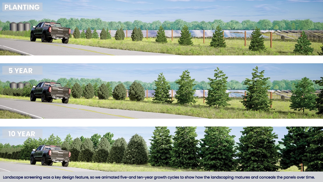 Tailored views from porches and roadways showed exactly how the site would appear, while animated growth cycles demonstrated how vegetation would conceal solar panels over time. These compelling visuals enabled Geenex to gain city approval and community trust, highlighting a commitment to transparent, community-first development.